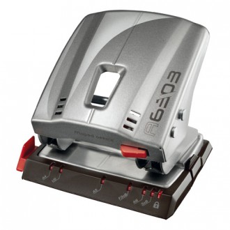 2 rupe; buši do 35 listova; razmak između rupa 8 cm; metalni mehanizam; plastični graničnik za formate A4, A5 i A6; jamstvo 5 godina